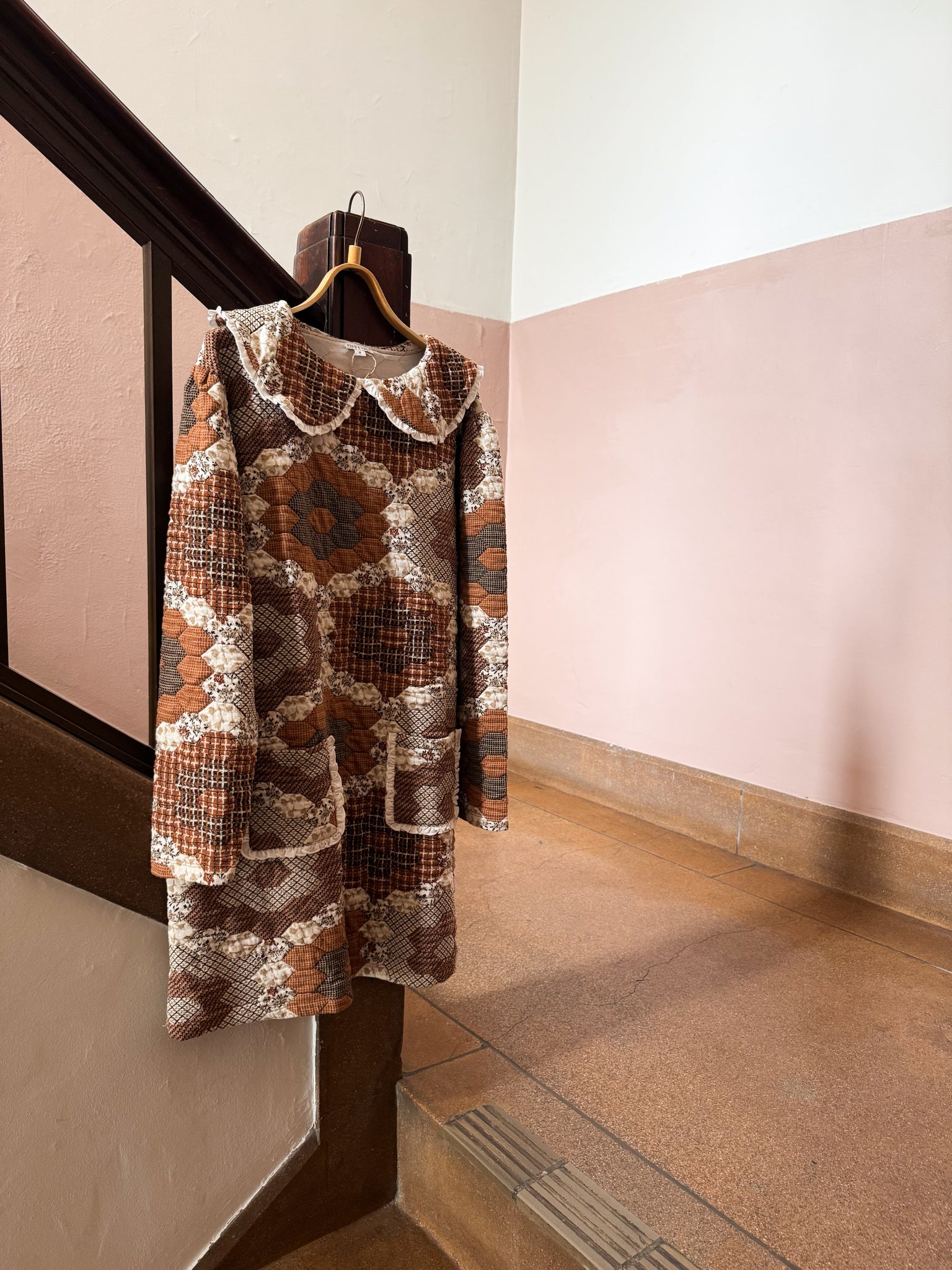 パッチワークのデザインが華やかな大きな襟付ワンピース。