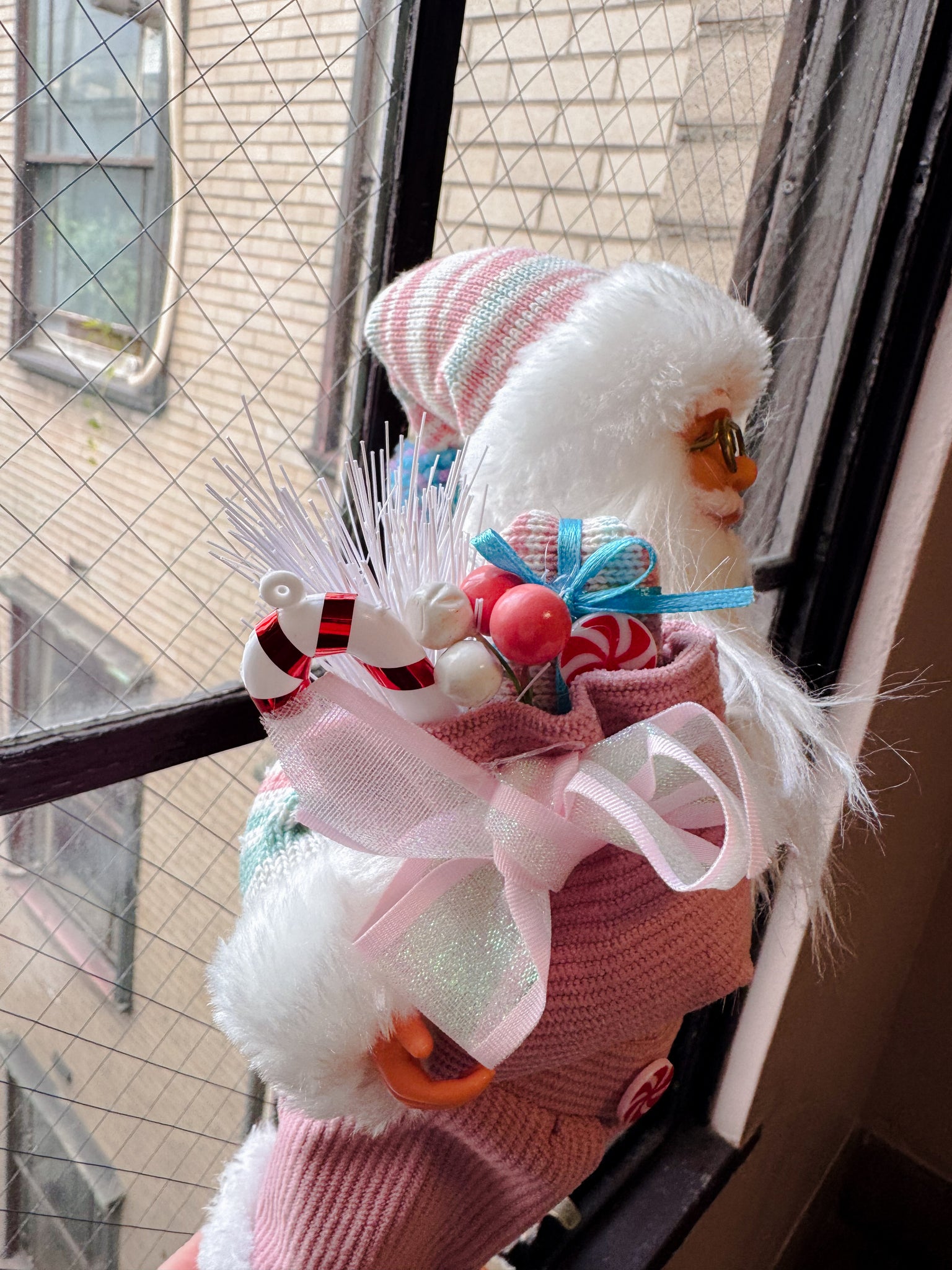 サスペンダー付きのコーデュロイのパンツにボーダーのトップスを身にまとったおしゃれなクラシックサンタ。キャンディケインのボタンも付いてとてもかわいいです。