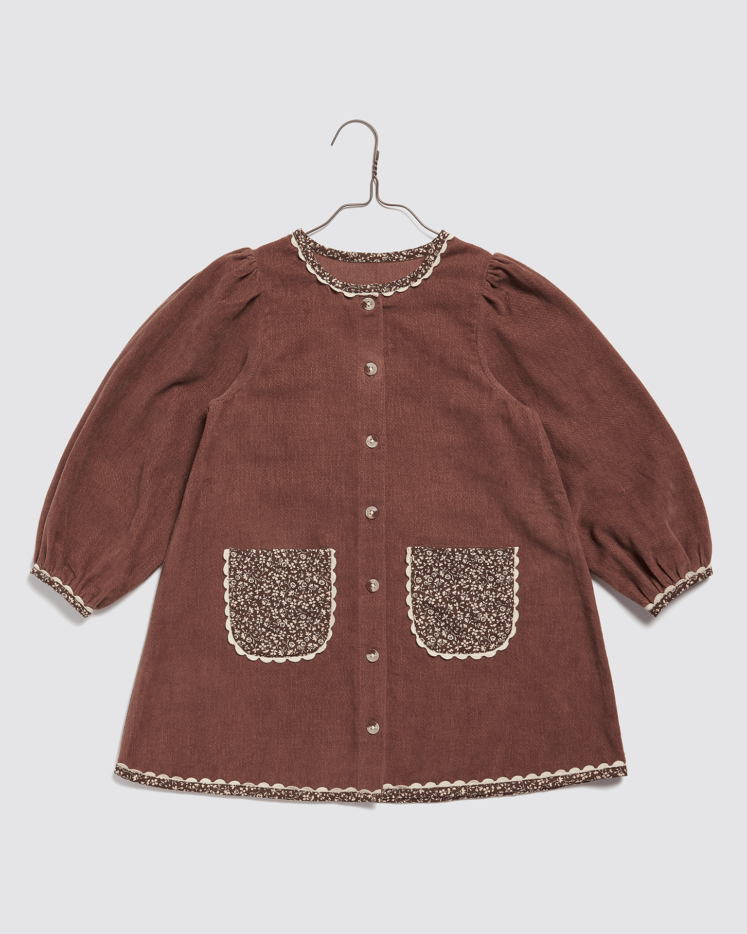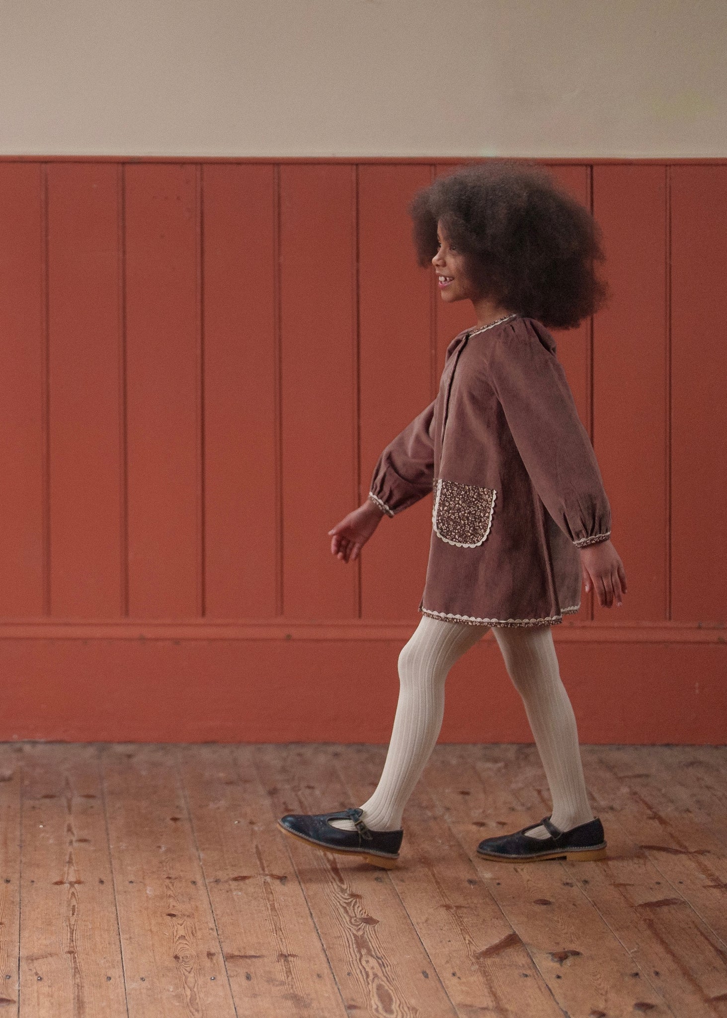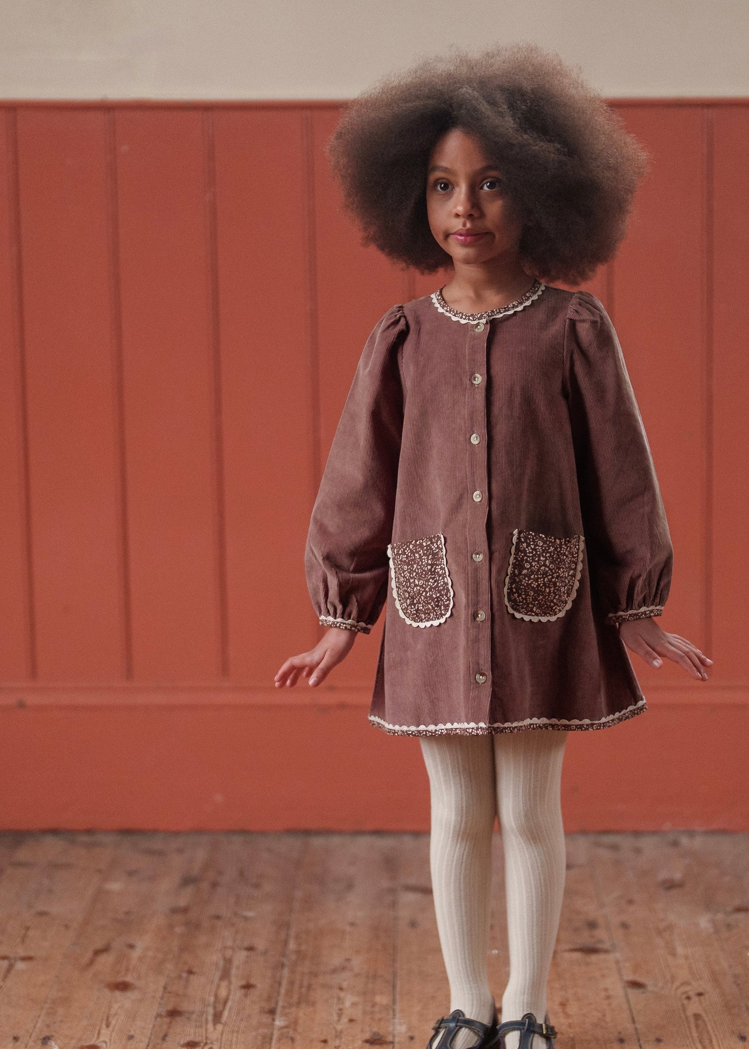 小花柄のパッチポケットがかわいいヴィンテージライクなAラインのベロアワンピース。