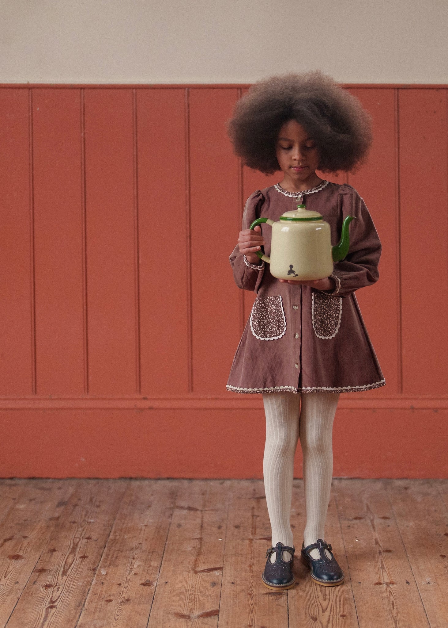 首元や袖や裾、ポケットにはスカラップの縁取りが施されており美しいディテールに。