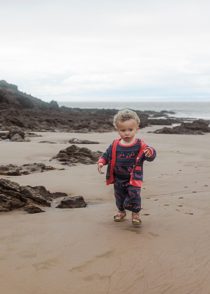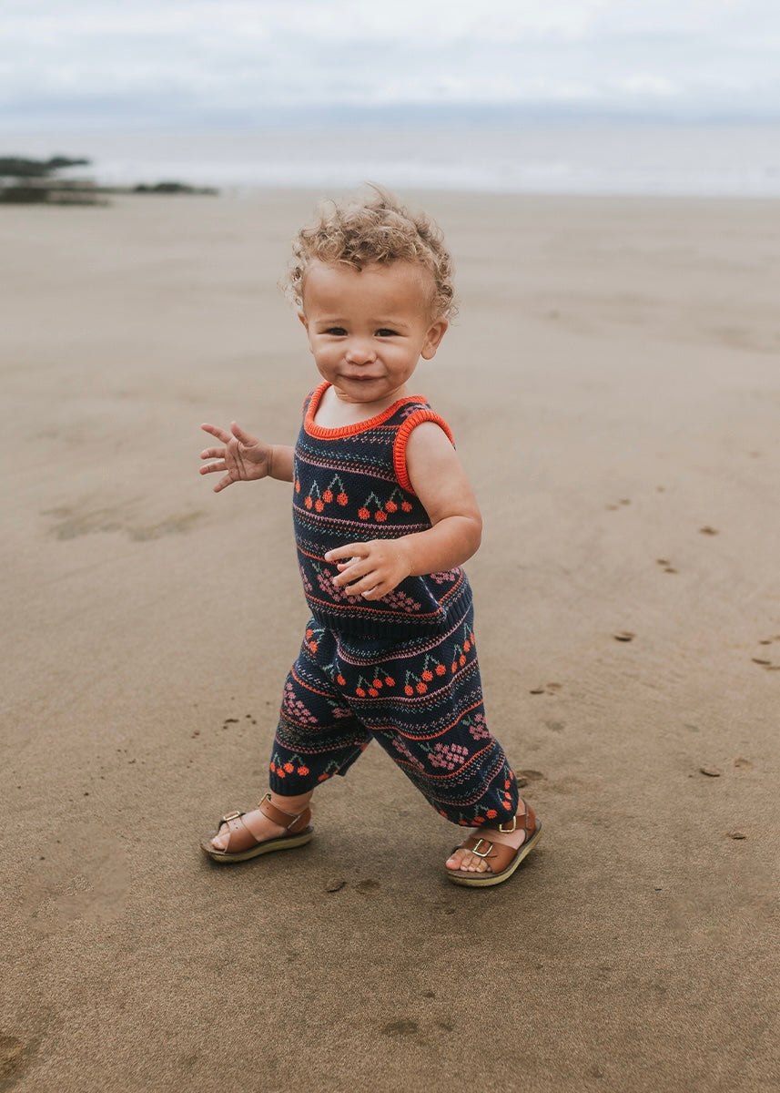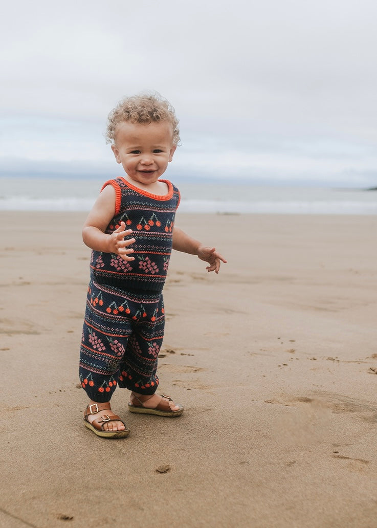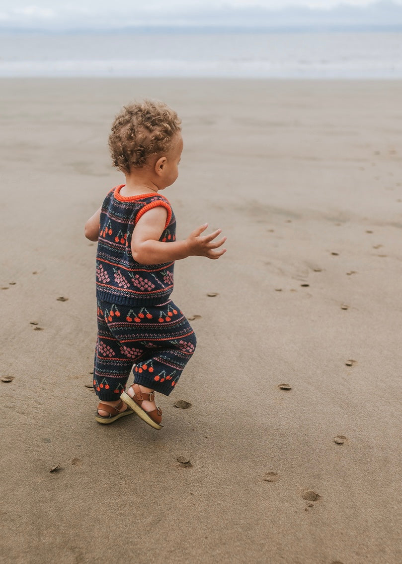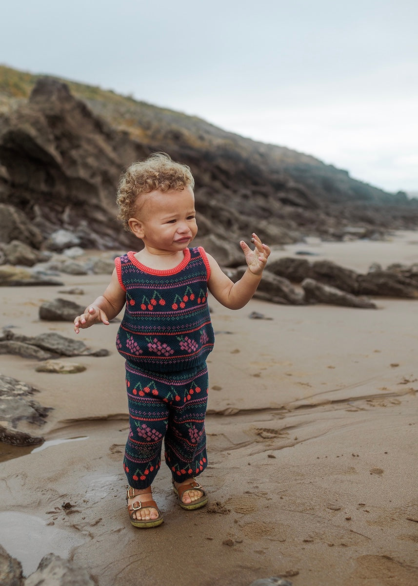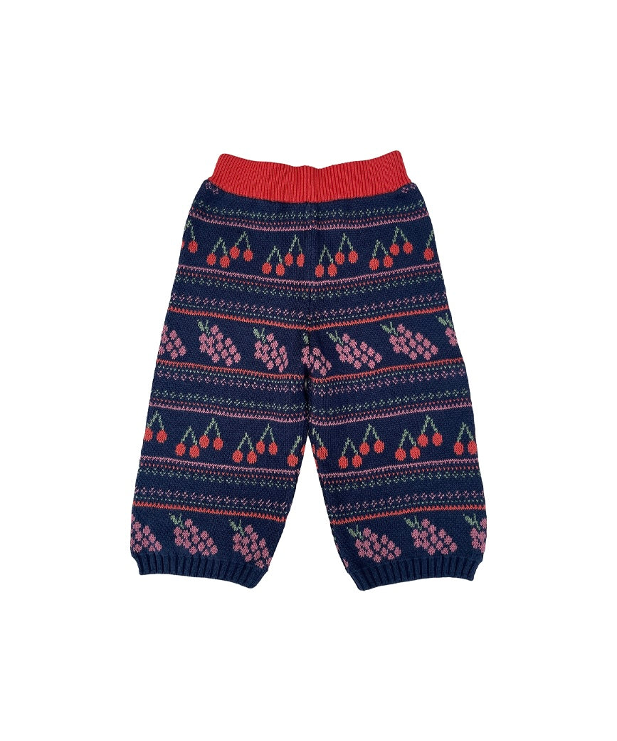 さくらんぼやぶどうのフルーツ柄が特徴のパンツ。