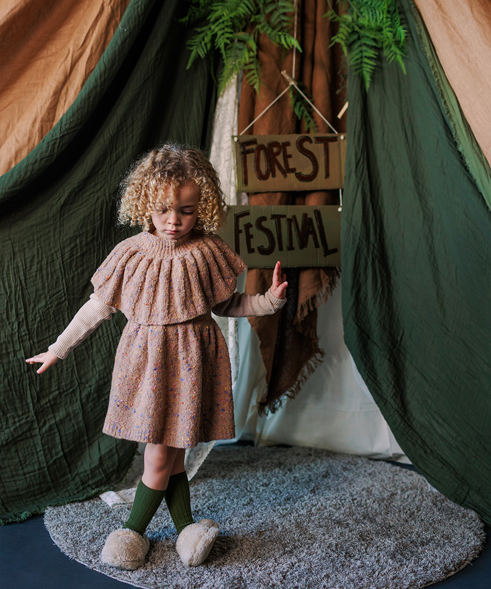 ブルーや黄色,オレンジなどカラーネップが散りばめられたストラップ付きニットスカート。