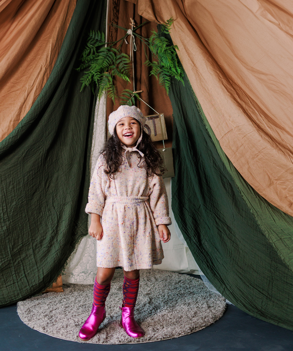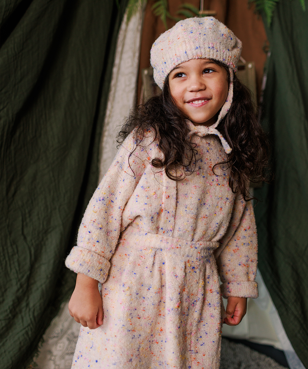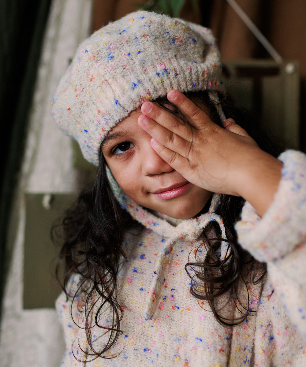 ブルーや黄色,オレンジなどカラーネップが散りばめられたTamベレー帽。
