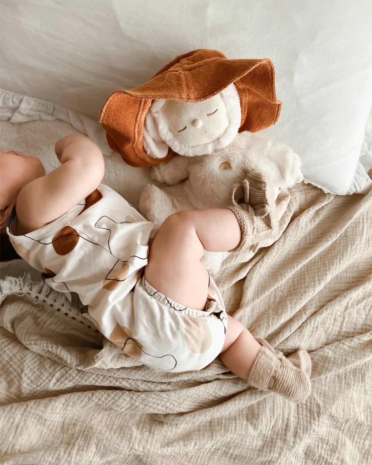 肩はウッドボタン、股にはスナップボタン付きでお着替えが簡単です。