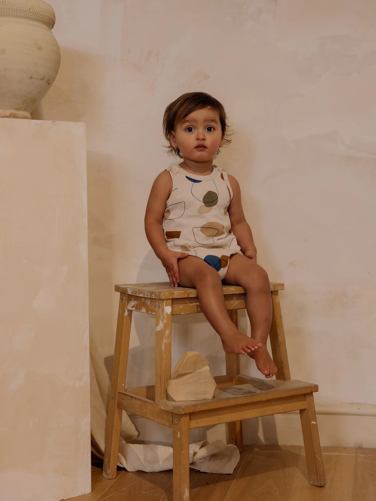セラミックのプリント柄ノースリーブロンパース。