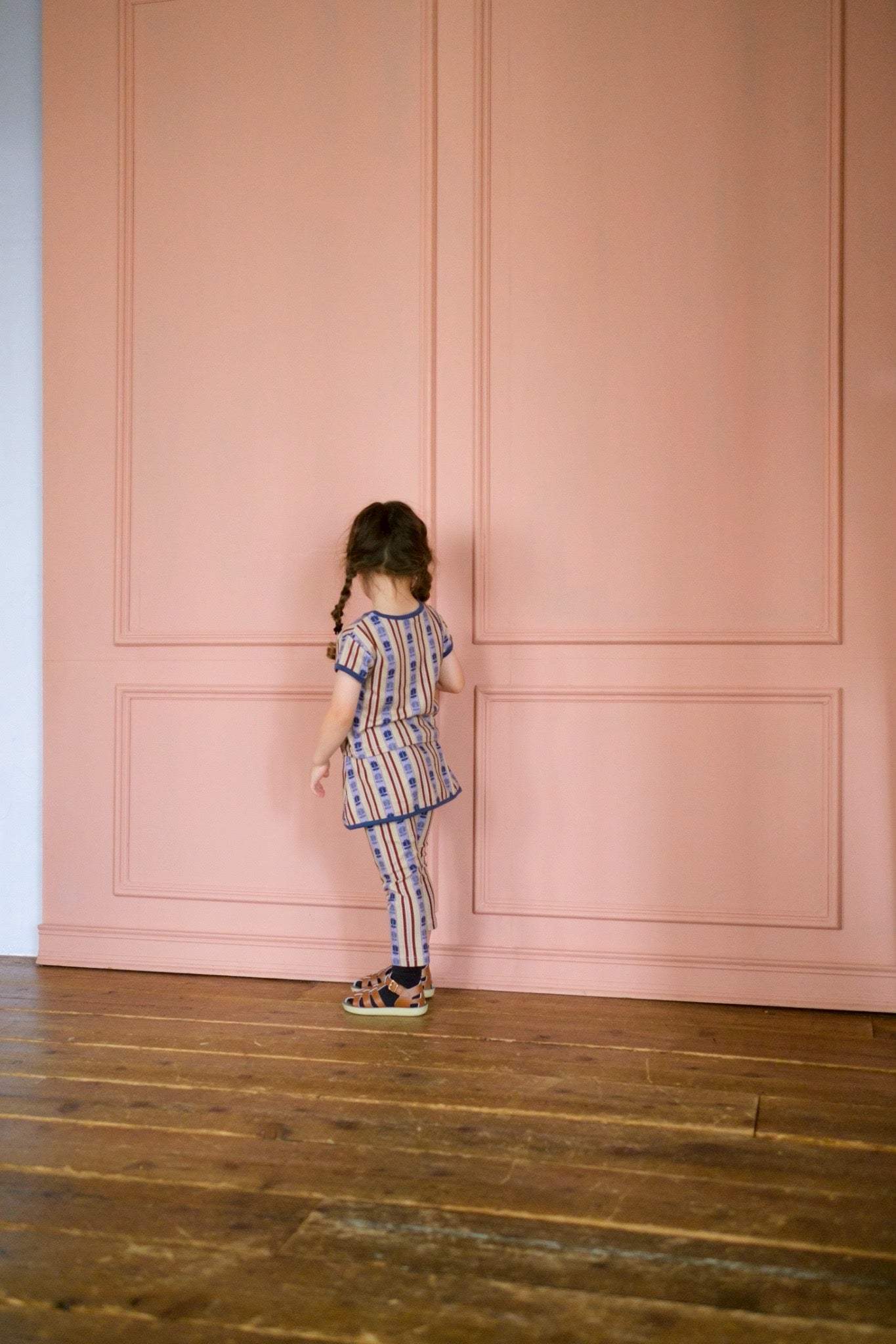 レトロ調のカラーにストライプ柄が特徴のスカッツパンツ。