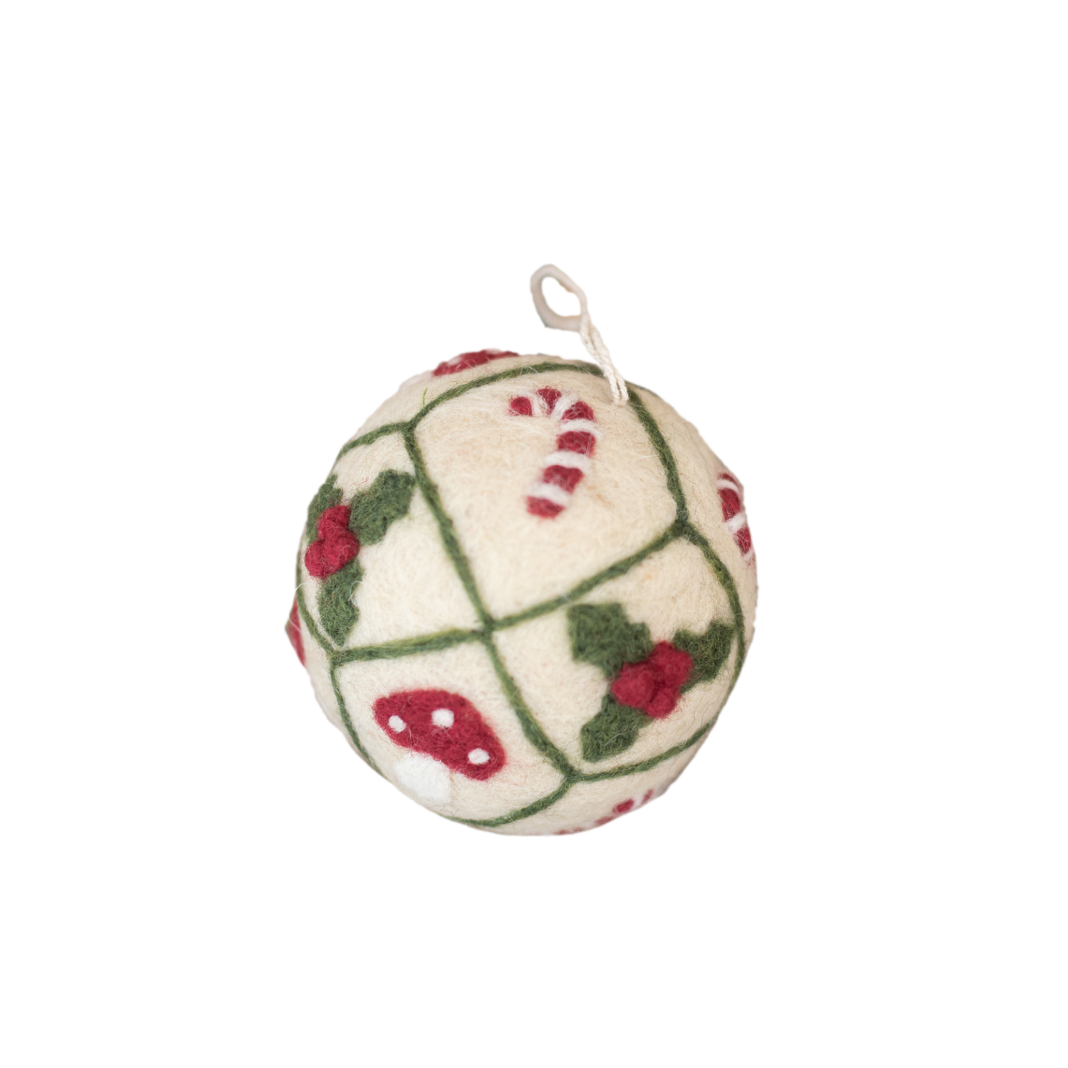マッシュルームやもみの木、キャンディーケインの刺繍が施されたオーナメント。