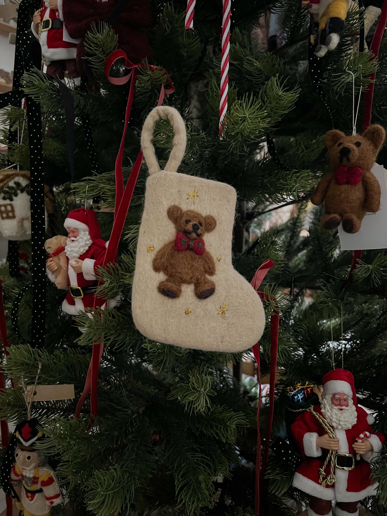 テディベアの刺繍が施されたデコレーションに最適な靴下のオーナメント。
