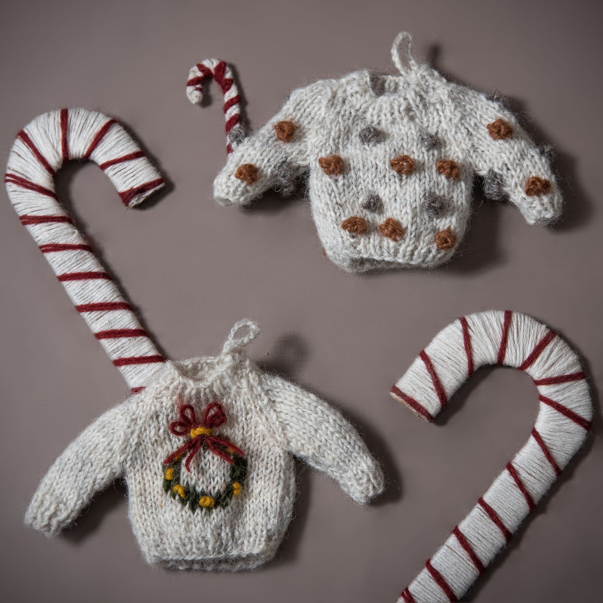 リースの刺繍が施されたセーターの形をした淡いグレーニットのオーナメント。