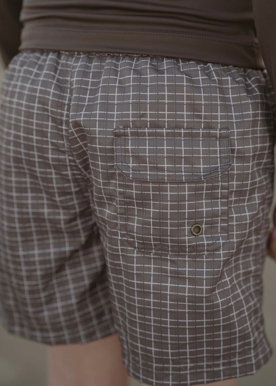 シンプルなトップスに落ち着いたチェック柄のボトムスのラッシュガード。