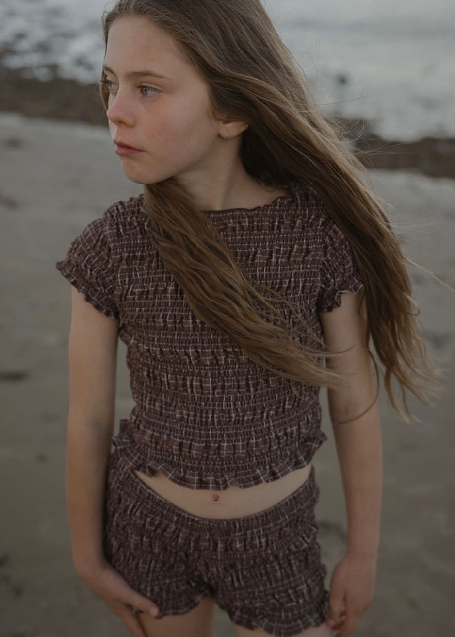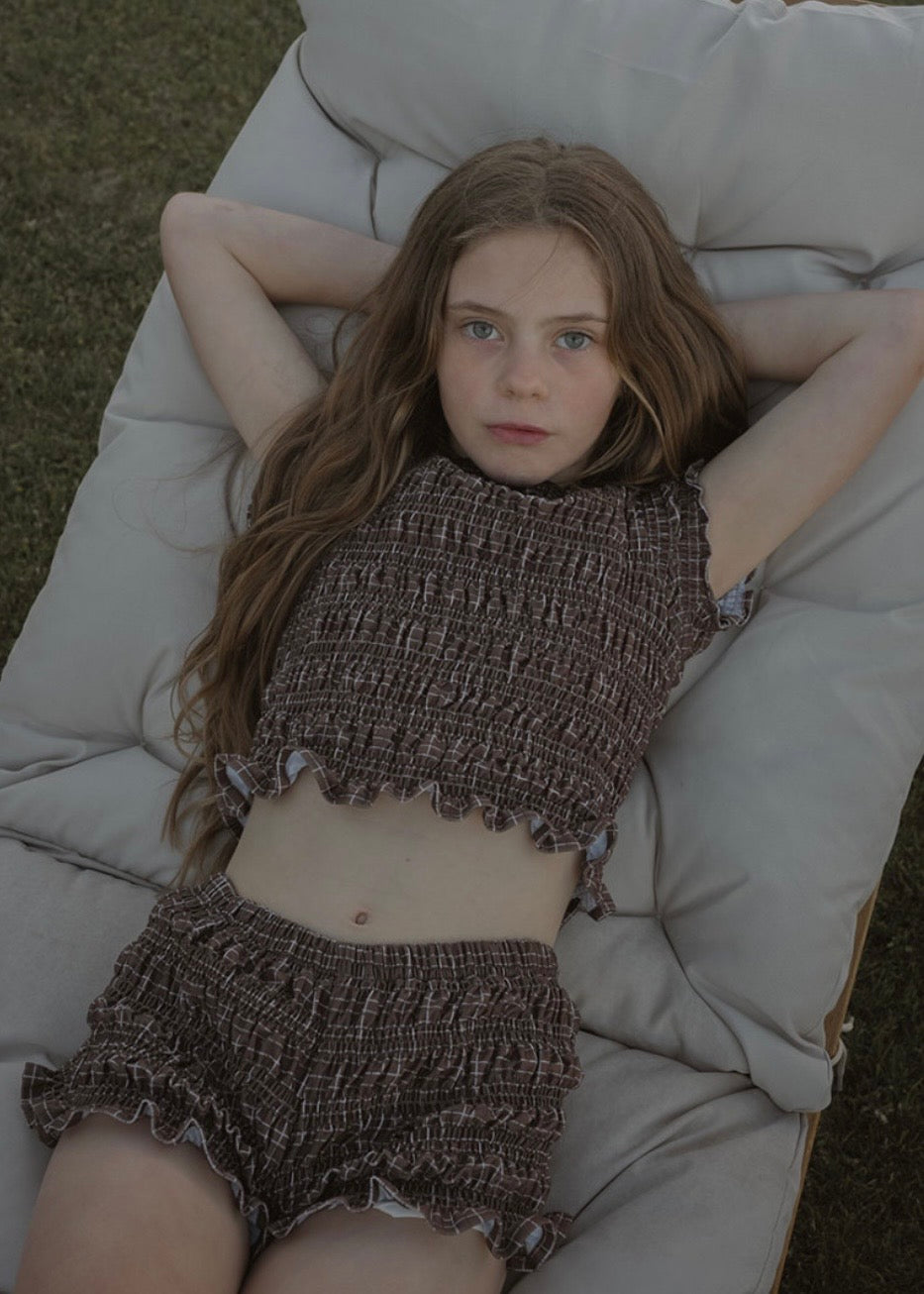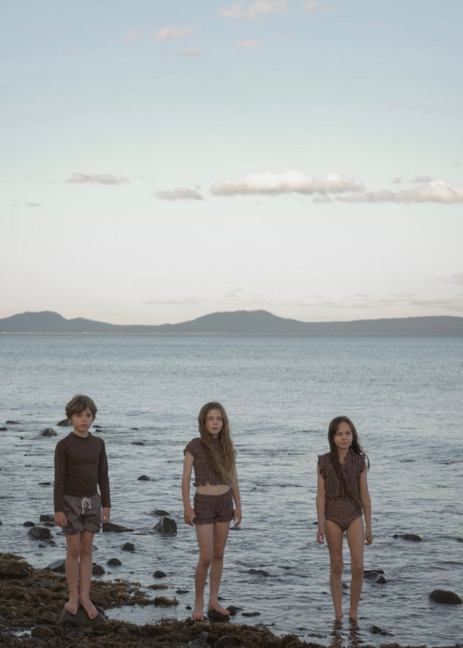 落ち着いたブラウンのカラーにチェック柄が特徴のスウィムウェア。