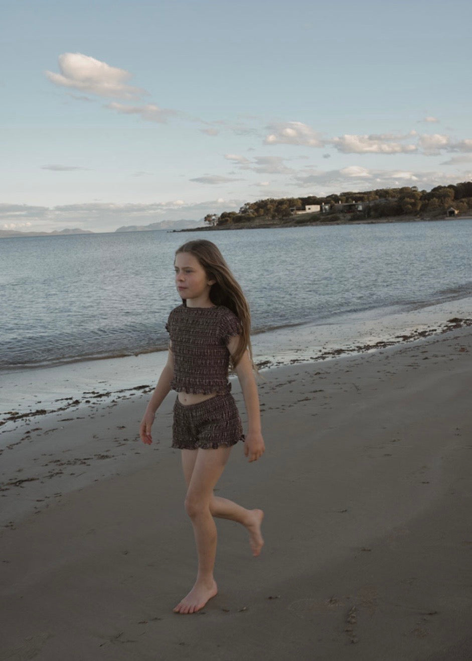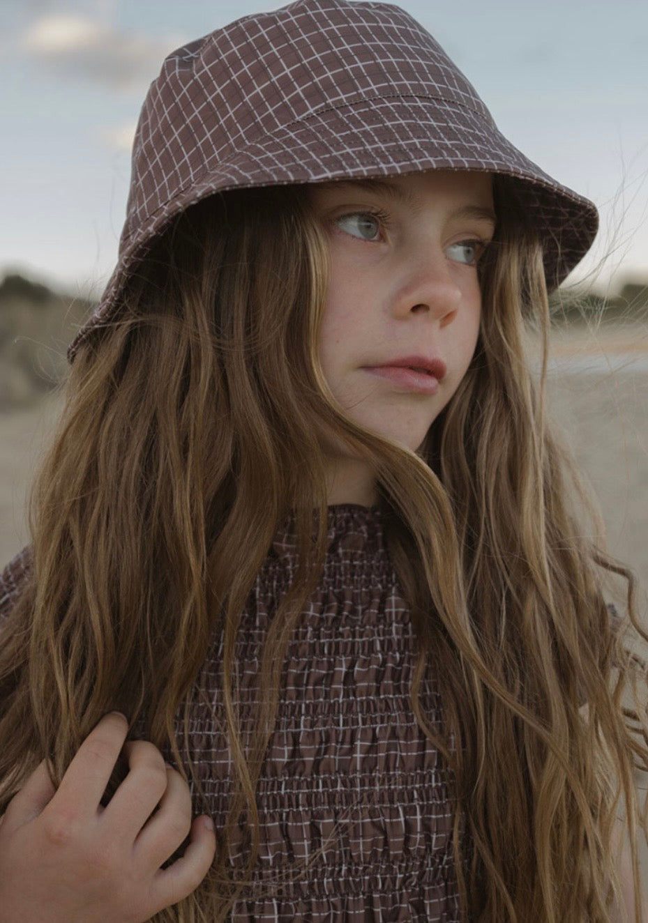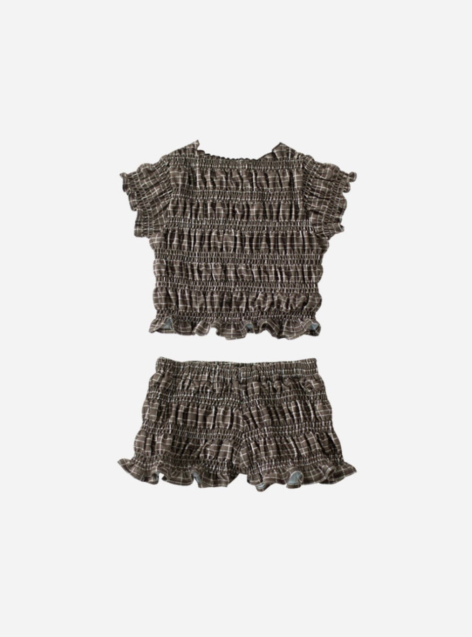 落ち着いたブラウンのカラーにチェック柄が特徴のスウィムウェア。