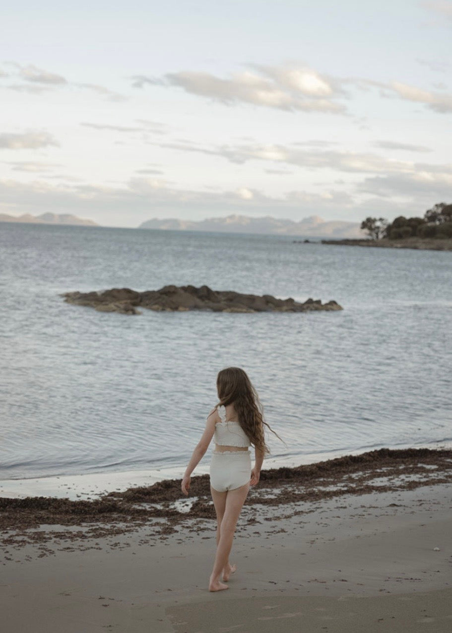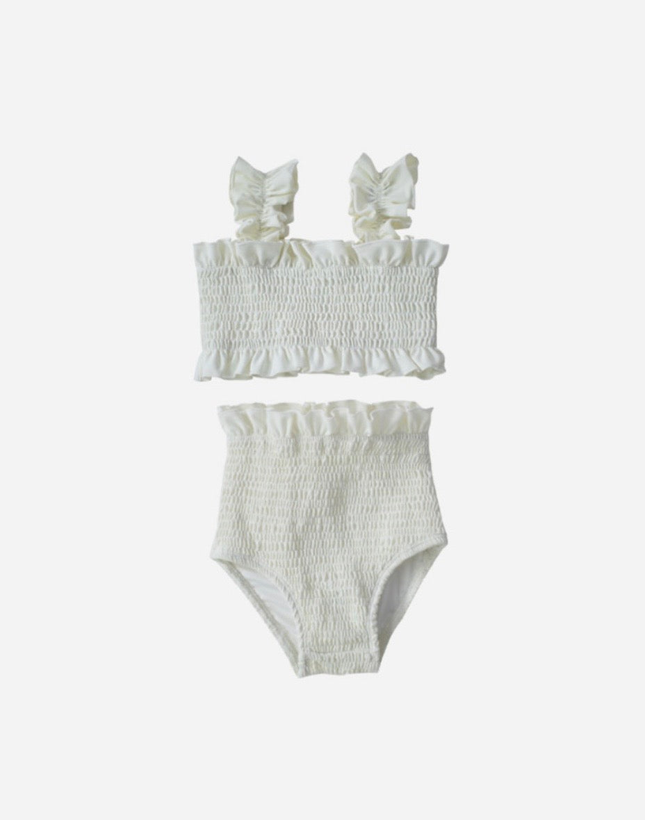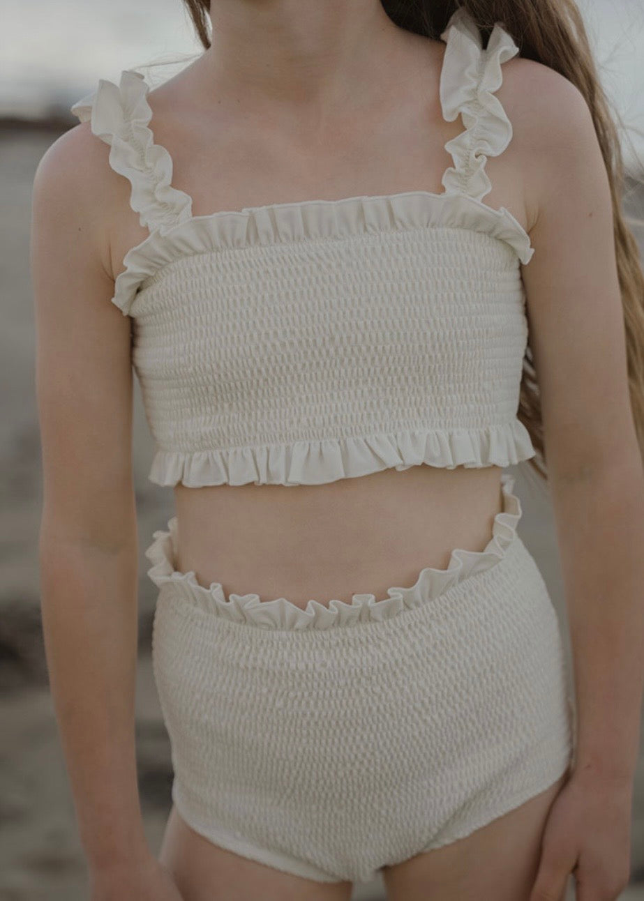 贅沢なスモッキングのディテールにフリル使いがポイントのビキニ。