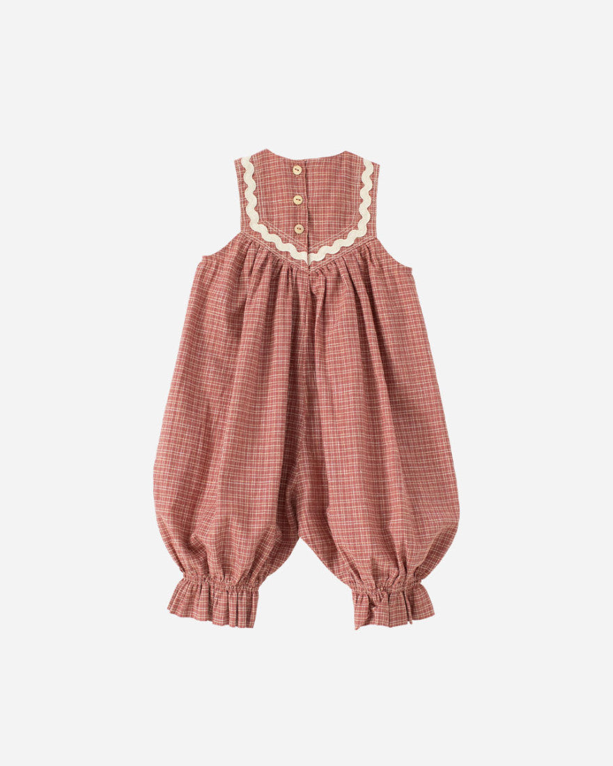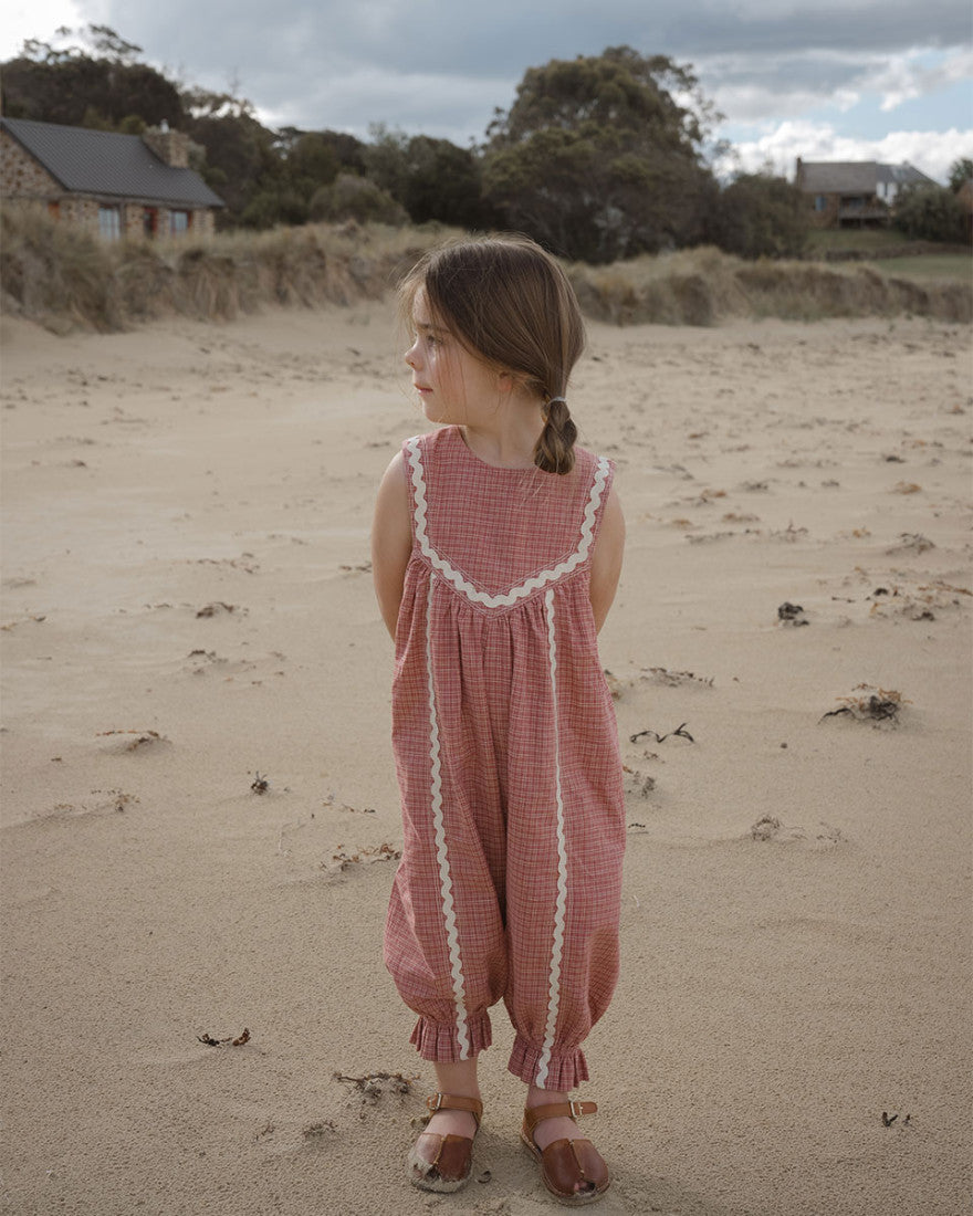 チェック柄にリックラックトリムのディテールが目を惹くノースリーブのジャンプスーツ。