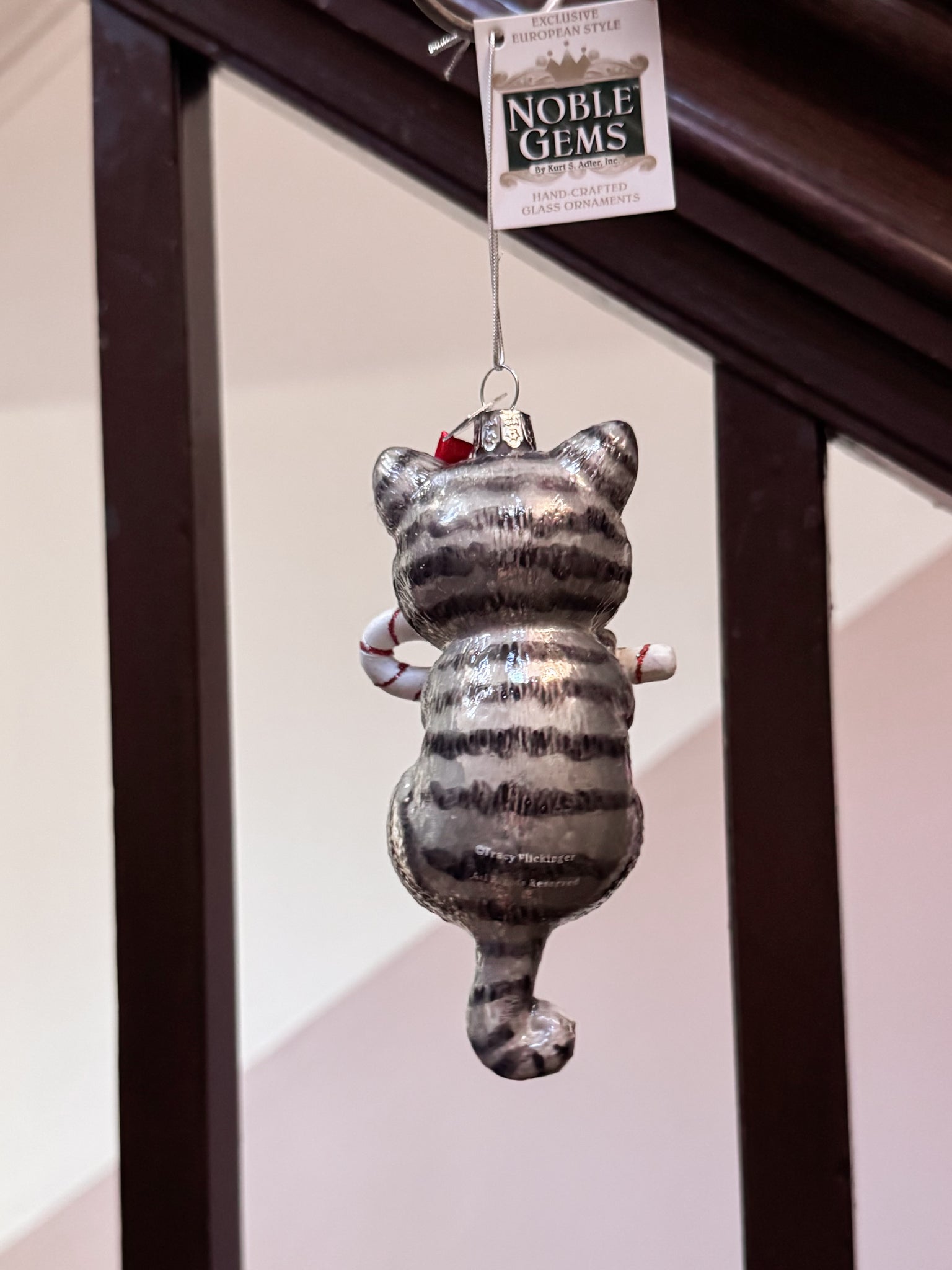 クリスマスの耳飾りにキャンディーケインを持ったねこのオーナメント。