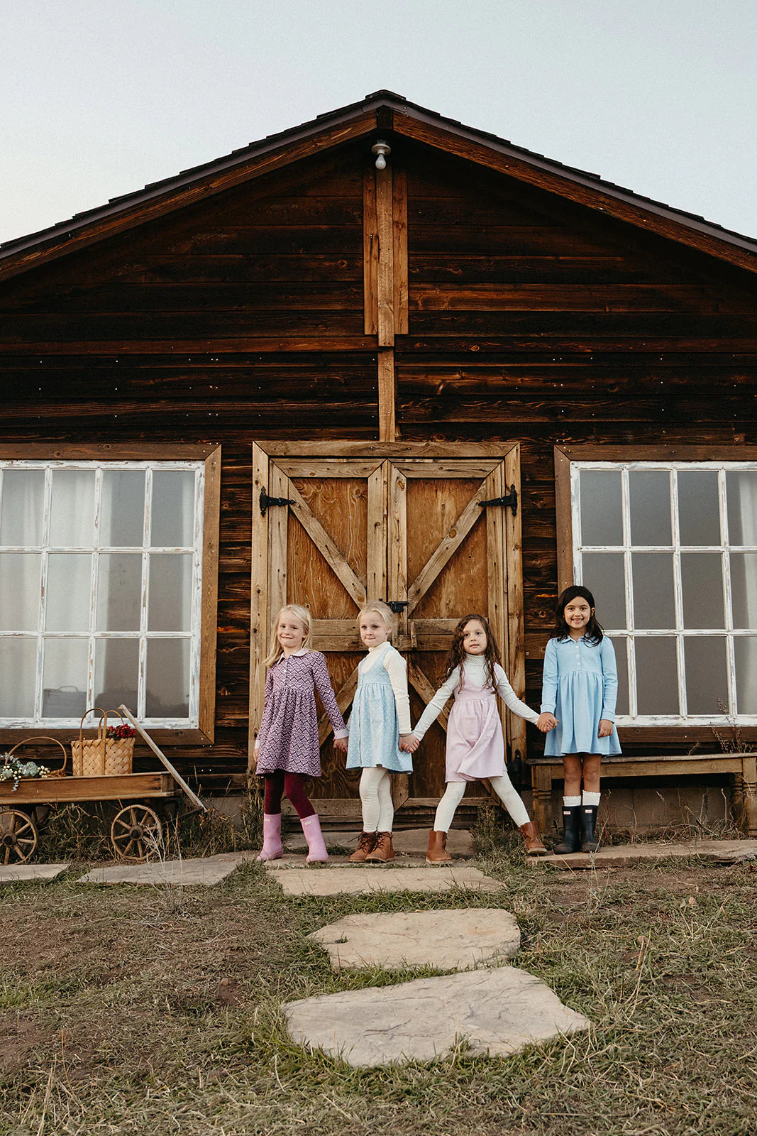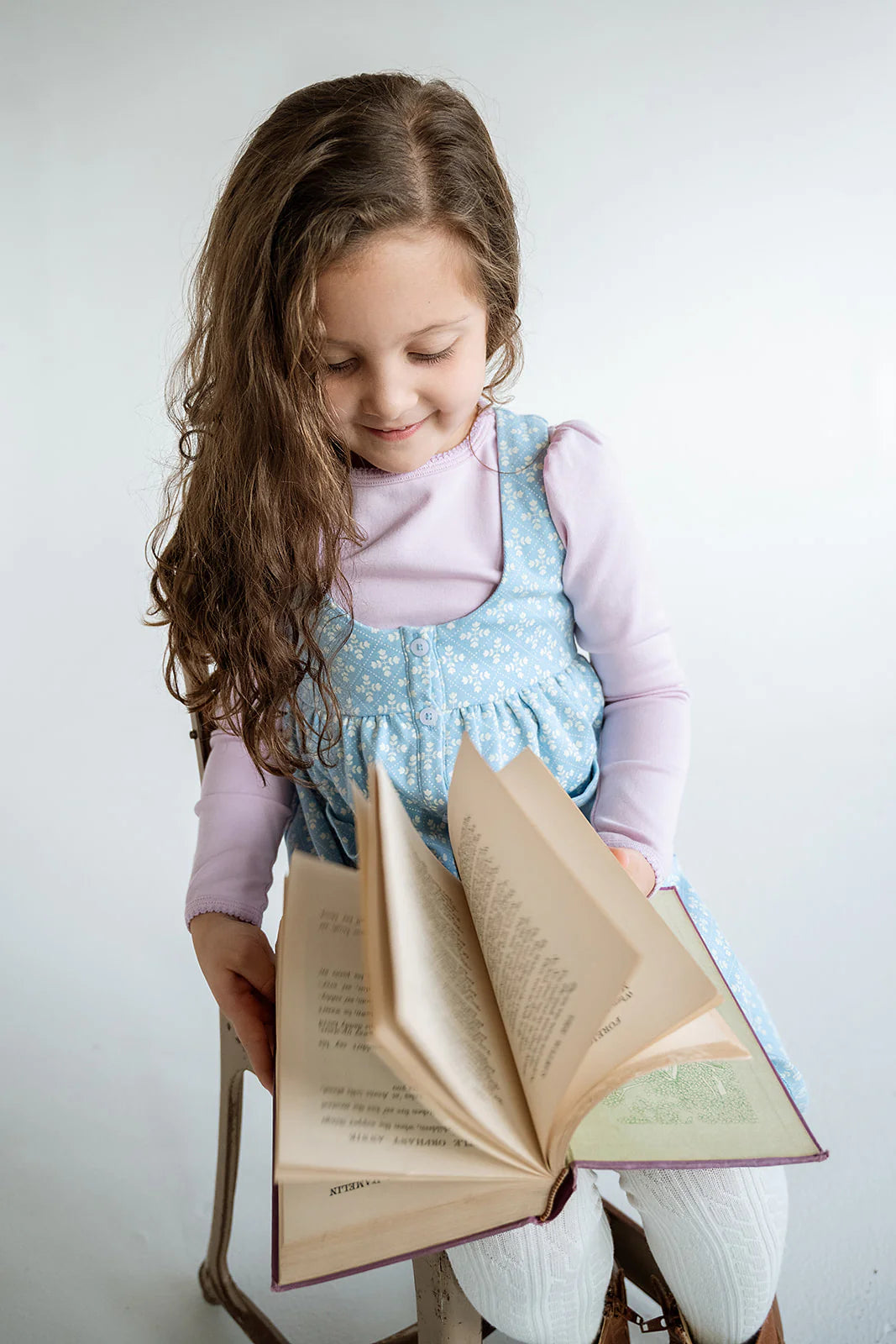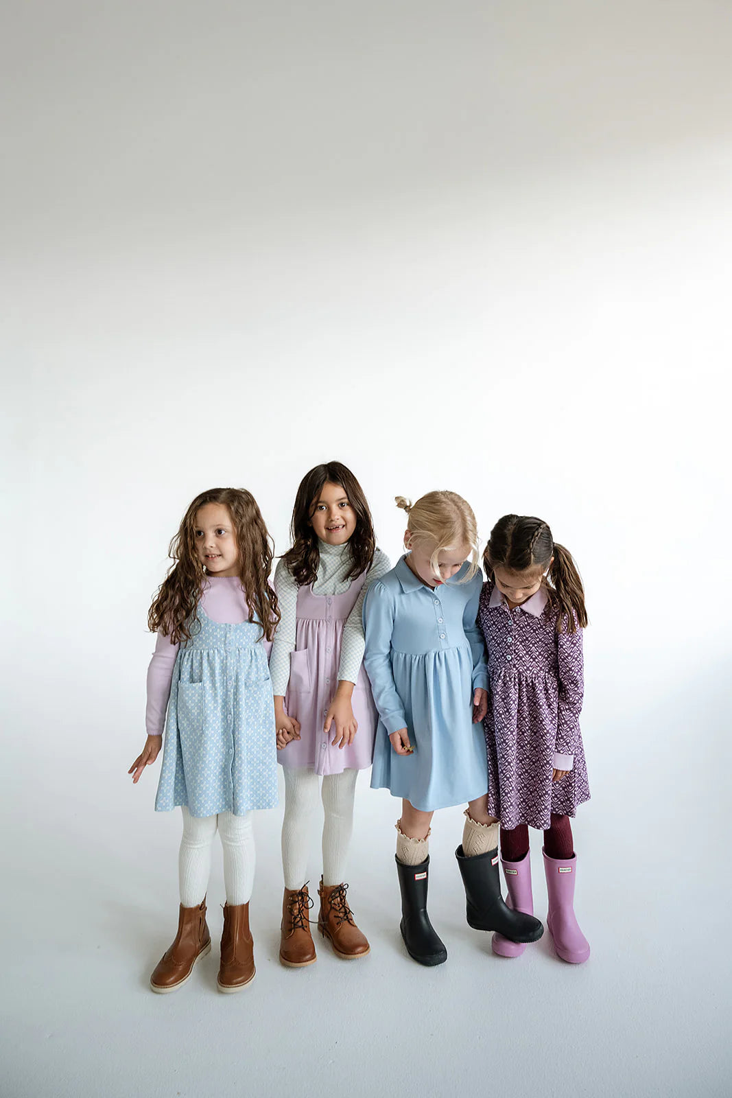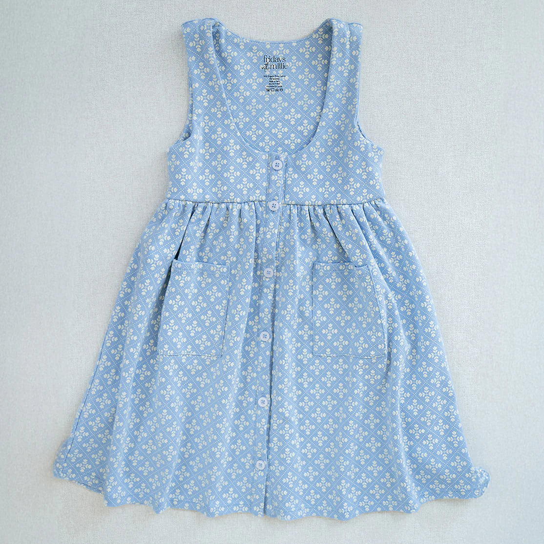 チューリップが並んだアートのようなテキスタイルがかわいいピナフォア。