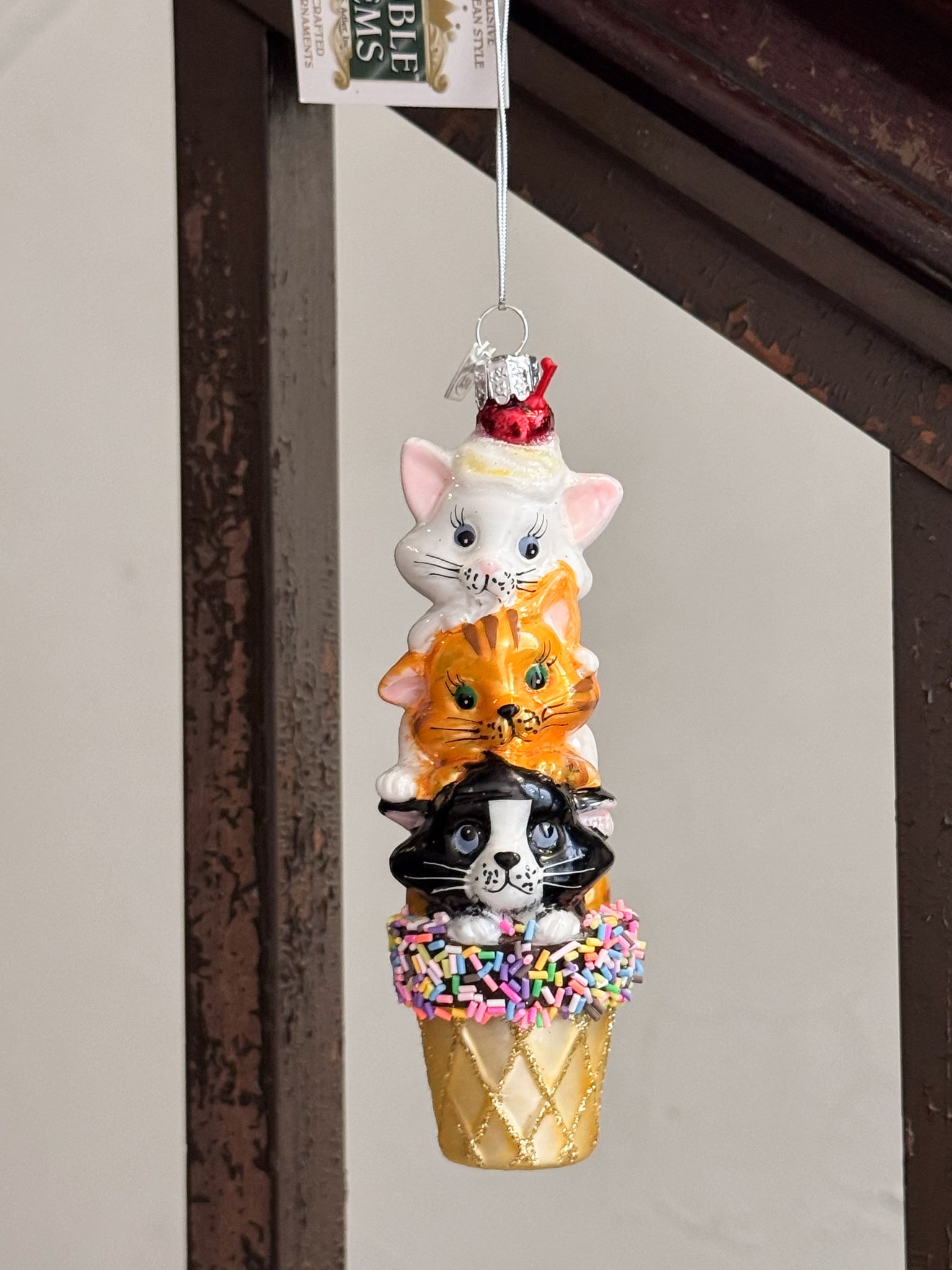 3匹のネコとチェリーのアイスクリームデザインが珍しいオーナメント。